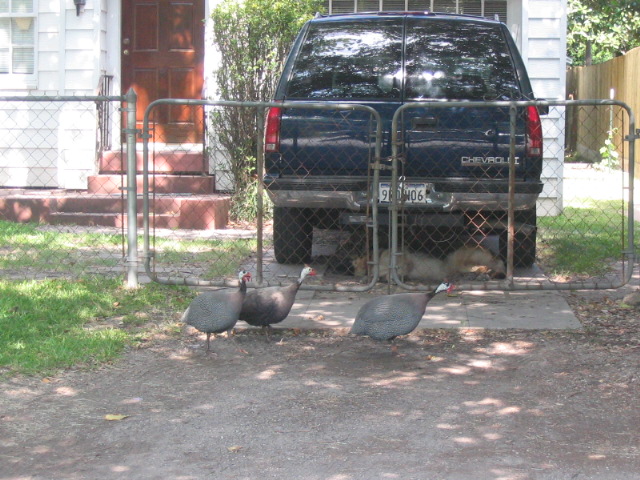 these are guinea fowl. they run around my neighborhood. we're all so used to them... look at that dog sleeping right next to them!